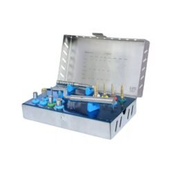 The Advanced Sinus Lift Kit with Drill Stoppers is a comprehensive instrument set designed for controlled and safe sinus lift procedures during dental implant surgery. The kit includes hand drivers, sinus lift instruments, and precision drill stoppers, all organized in a sterilization cassette for convenient storage and sterilization.